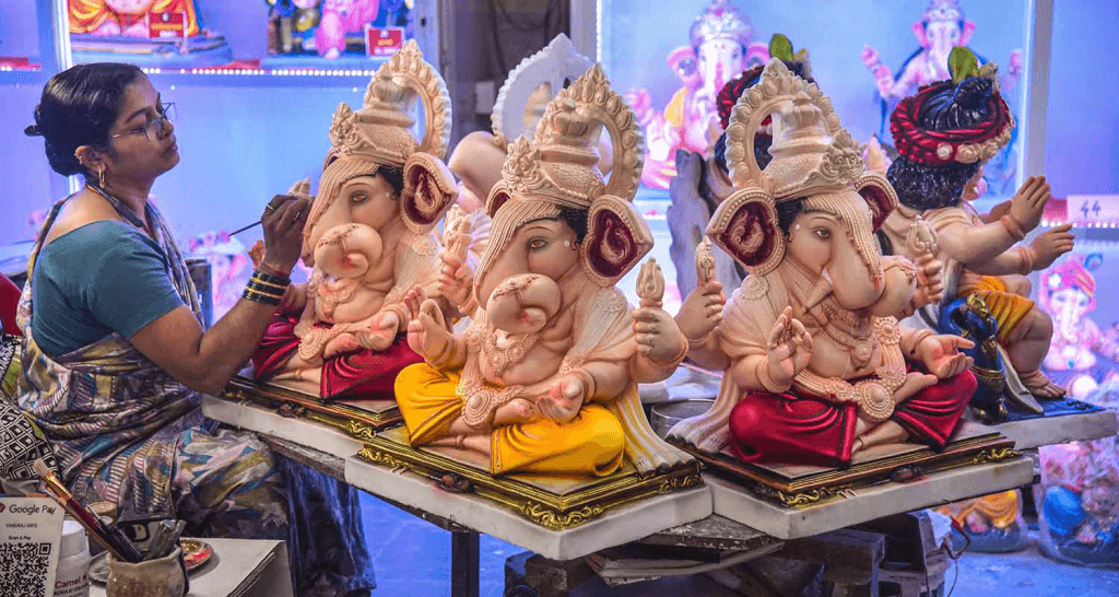 3. Community Festivities: Large, ornate pandals are set up in neighborhoods, featuring massive, artistically designed Ganesha idols. These become hubs of cultural activity, with music, dance, and theatre performances that bring the entire community together.
