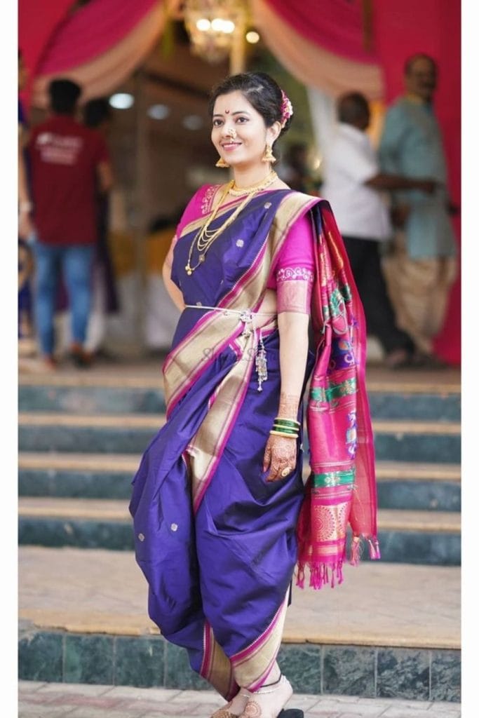 To style a Nauvari saree for modern occasions, consider pairing it with statement jewelry like a nath (nose ring) or traditional Kolhapuri sandals. For a more contemporary twist, you can experiment with sleeveless or contrast blouses and minimalistic accessories. However, it’s essential to keep the look balanced, as the saree itself carries rich patterns and designs.